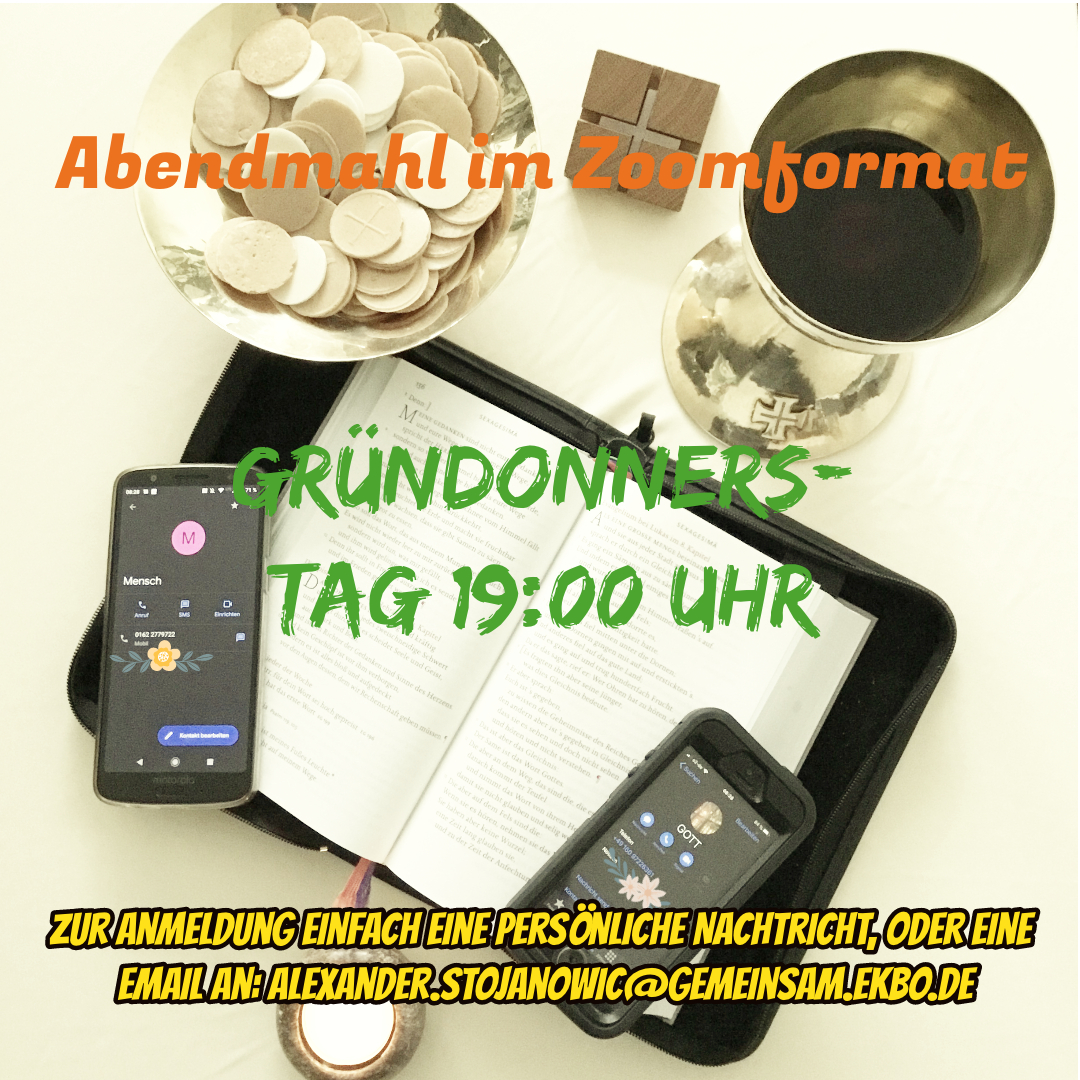 Weil es in diesem Jahr nur wenig Möglichkeiten für ein gemeinsames Abendmahl gibt, nutzen wir die, die wir haben, via Zoom. Ich habe meinen ersten Abendmahlsgottesdienst in dieser Form das erste mal vor knapp einem Dreivierteljahr gefeiert. Ja ich war skeptisch, weil auch in meinem Herzen ein kleiner Muskelstrang traditionell zuckt. Aber während des Feierns und seit dem habe ich ein gutes Gefühl dabei. Es ist eine eigene Form, eine neue Form, aber eine die es sich lohnt zu erfahren. Also nur Mut!