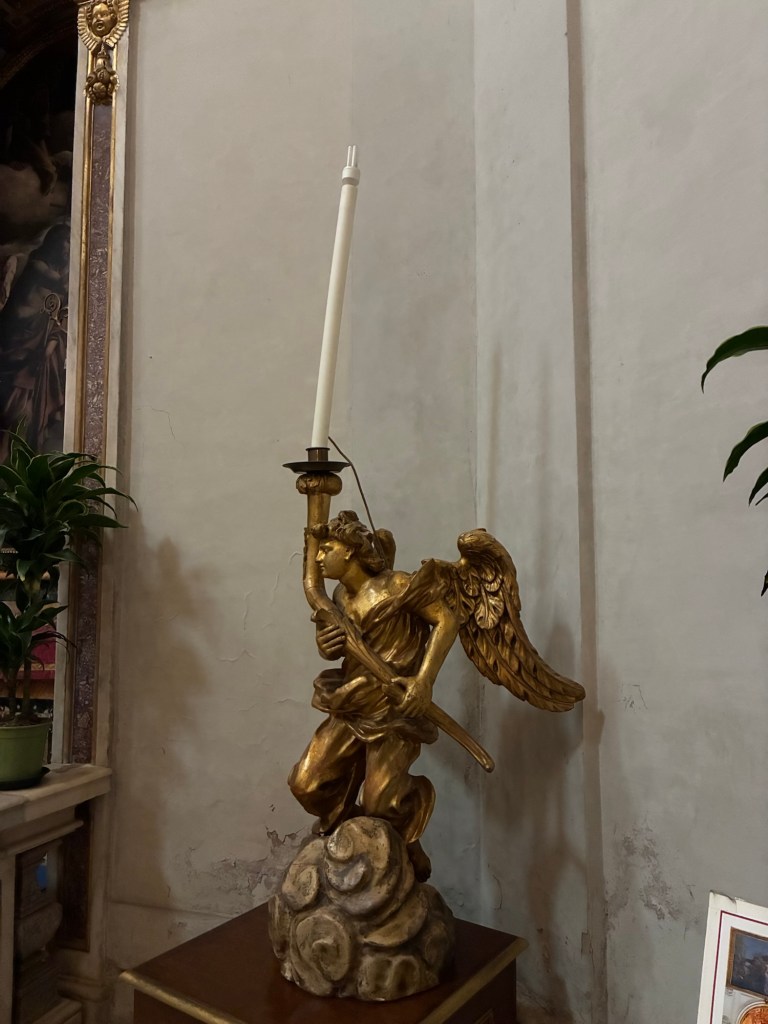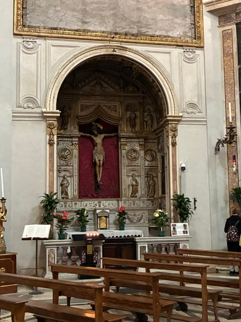 In Rom ist ein schlichtes Kruzifix an einer gekalkten Wand beinahe eine Rarität. Gerade weil so vieles kunstvoll gestaltet ist, fällt das Einfache besonders auf. Ein schlichtes Holzkreuz ohne große Inszenierung kann plötzlich zu einem Ort der Sammlung werden. Es erinnert daran, dass der Kern des christlichen Glaubens nicht im Glanz liegt, sondern im Kreuz. Im Leiden, in der Hingabe, in der radikalen Nähe Gottes zum Menschen.